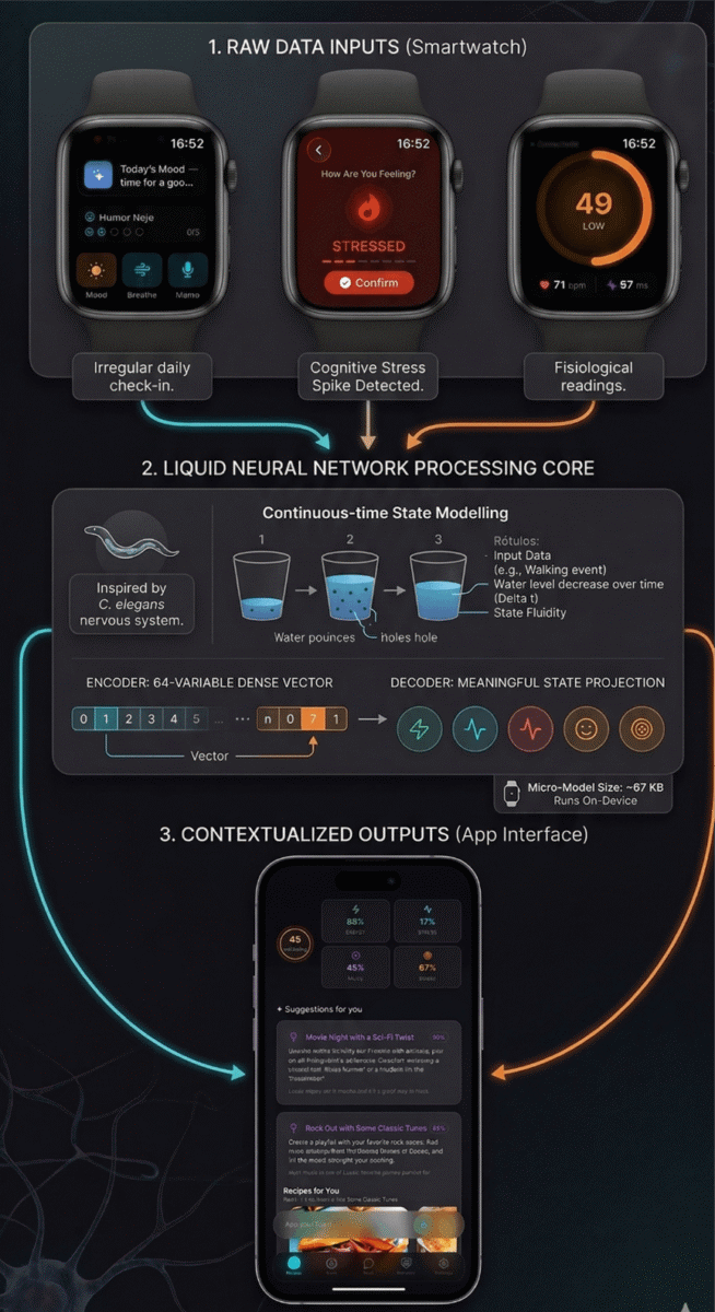 Everything starts at the wrist, capturing both raw physiological signals like heart rate and HRV (heart rate variability), and rapid emotional check-ins that flag stress spikes. That stream of irregular data flows down into the “liquid processing core” (the LNN).