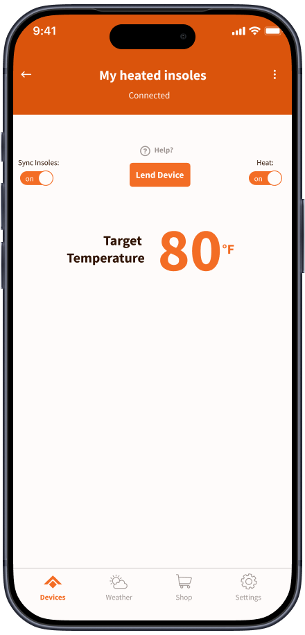 We synced local weather forecasts into the app. This way, users could not just check the weather for the days they plan to be outside, but the app could push through notifications to warn users of changing conditions and remind them to charge up their in-soles, hand warmers, or seat pad.